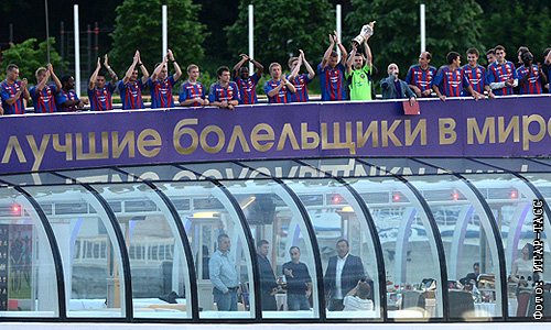 Московский ЦСКА в среду вечер отметил победу в чемпионате России по футболу вместе с болельщиками. Сначала руководство, тренеры и футболисты встретились с журналистами, а затем на корабле отправились в "Лужники", чтобы встретиться с болельщиками, где для поклонников красно-синих была организована фан-зона.