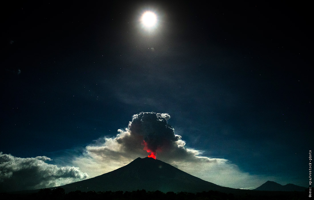 Вулкан Агунг на индонезийском острове Бали перешел в активную фазу извержения. Вулканический пепел поднялся на высоту 2,5 км и засыпал тонким слоем близлежащие населенные пункты. В международном аэропорту Бали отменены все авиарейсы. Агунг стал проявлять активность в прошлом году. Последнее извержение этого вулкана в 1963 году привело к гибели тысячи человек и ранениям сотен.