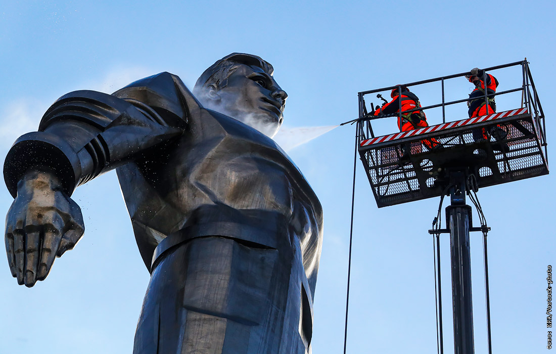 Памятник Юрию Гагарину в Москве помыли ко Дню космонавтики