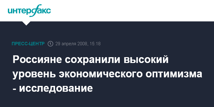 Москва. 29 апреля. ИНТЕРФАКС-АФИ - Россияне сохранили высокий уровень экономического оптимизма, заявил руководитель Центра стратегических исследований "Росгосстраха" (РТС: RGSC) Алексей Зубец на пресс-конференции в центральном офисе "Интерфакса" во вторник, ссылаясь на результаты проведенного компанией исследования.