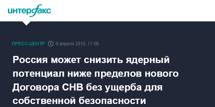 Москва. 9 апреля. ИНТЕРФАКС-АВН - Задача стратегического ядерного сдерживания может быть решена Россией при меньшем числе носителей и ядерных зарядов, чем указано в новом Договоре по СНВ, считает В.Есин.