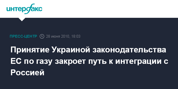 Москва. 28 июня. ИНТЕРФАКС-АГИ - Украина в настоящее время имплементирует европейское законодательство в газовой сфере в национальное законодательство, но это может закрыть ей путь к интеграции с Россией, заявил вице-спикер Госдумы, президент НП "Российское газовое общество" Валерий Язев.