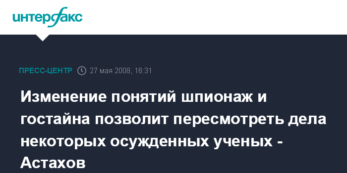 "Я принял предложение войти в Общественный совет ФСБ, где на последнем заседании, в частности, обсуждалась возможность изменения таких понятий, как шпионаж, доступ к гостайне, ряда других. Я вижу в этом реабилитирующую составляющую для тех ученых, которые уже осуждены по этим статьям, и это может помочь тем, кто сейчас в силу обстоятельств оказался в сложном положении", - сказал П.Астахов во вторник в центральном офисе агентства "Интерфакс" на презентации своей книги "Шпион".