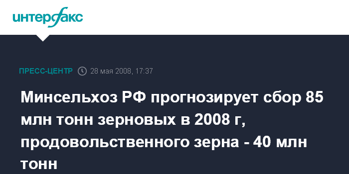 Минсельхоз РФ прогнозирует сбор 85 млн тонн зерновых в 2008 г, продовольственного зерна - 40 млн тонн