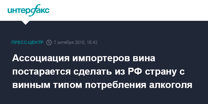 Москва. 7 октября. ИНТЕРФАКС - Ассоциация импортеров вина (АИВ) постарается сделать из России страну с винным типом потребления алкоголя.