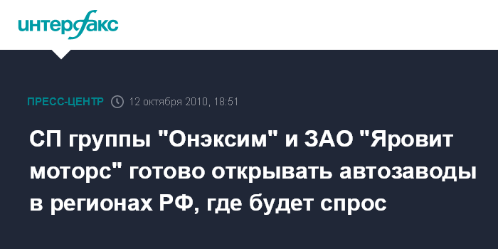 СП группы "Онэксим" и ЗАО "Яровит моторс" готово открывать автозаводы в регионах РФ, где будет спрос