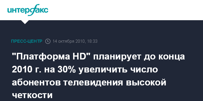 Москва. 14 октября. ИНТЕРФАКС - Компания "Платформа HD", оператор системы платного телевидения в формате высокой четкости (HDTV), планирует до конца этого года увеличить число абонентов на 30%, сообщил генеральный директор компании Николай Гюббенет на пресс-конференции в центральном офисе "Интерфакса" в четверг в Москве.