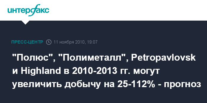 "Полюс", "Полиметалл", Petropavlovsk и Highland в 2010-2013 гг. могут увеличить добычу на 25-112% - прогноз