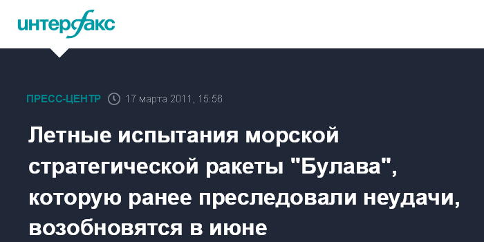 Летные испытания морской стратегической ракеты "Булава", которую ранее преследовали неудачи, возобновятся в июне