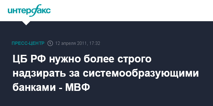 Москва. 12 апреля. ИНТЕРФАКС-АФИ - Международный валютный фонд (МВФ) призывает ЦБ РФ осуществлять более строгий надзор за системообразующими банками, сообщил заместитель директора управления МВФ по кредитно-денежным вопросам и рынкам капитала Димитри Демекас в ходе пресс-конференции по предварительным итогам оценки финансовой стабильности РФ в центральном офисе "Интерфакса" во вторник.