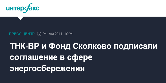 ТНК-BP и Фонд "Сколково" подписали соглашение о сотрудничестве в сфере энергосбережения в офисе агентства "Интерфакс" во вторник