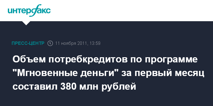 Объем потребительских кредитов, выданных по программе "Мгновенные деньги" за первый месяц ее работы, составил около 380 млн рублей