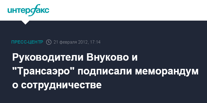 Москва. 21 февраля. ИНТЕРФАКС - Председатель совета директоров ОАО "Международный аэропорт "Внуково" Виталий Ванцев и генеральный директор авиакомпании "Трансаэро" Ольга Плешакова подписали меморандум о стратегическом сотрудничестве на пресс-конференции в центральном офисе "Интерфакса" в Москве во вторник.