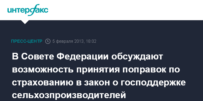 Профильный комитет Совета Федерации рассматривает возможность в весеннюю сессию 2013 года подготовки поправок в закон о господдержке сельхозпроизводителей, связанных с агрострахованием