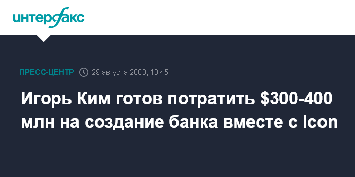 Москва. 29 августа. ИНТЕРФАКС-АФИ - Объем инвестиции в совместный проект совладельца УРСА банка Игоря Кима и фонда прямых инвестиций Icon Private Equity по созданию универсального банка, входящего в топ-50, может составить $300-400 млн.