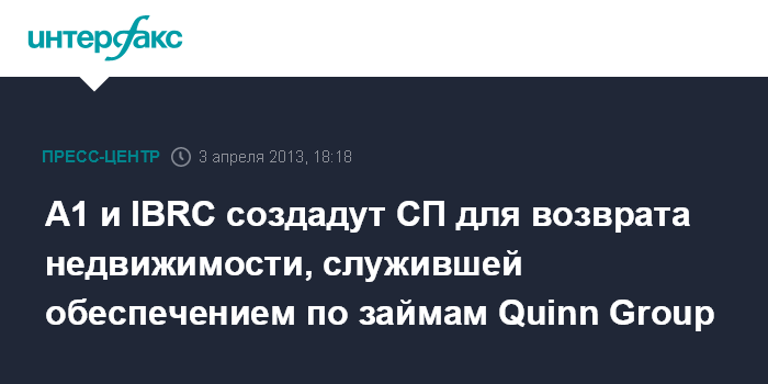 А1, инвестиционная структура "Альфа-групп", и Irish Bank Resolution Corporation (IBRC) заключили соглашение о создании совместного предприятия, которое займется возращением банку недвижимости в РФ и на Украине, служившей обеспечением по займам Quinn International Property Group