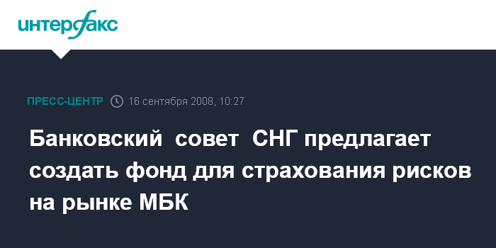 Москва. 15 сентября. ИНТЕРФАКС-АФИ - Финансово-банковский совет (ФБС) СНГ предлагает рассмотреть возможность создания фонда для страхования рисков на рынке межбанковского кредитования.
