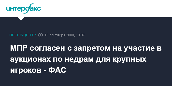 Москва. 16 сентября. ИНТЕРФАКС - Министерство природных ресурсов и экологии (МПР) поддерживает запрет на участие в аукционах по недрам для компаний, владеющих лицензиями более чем на 35% разведанных месторождений, заявил глава ФАС Игорь Артемьев на пресс-конференции во вторник в центральном офисе агентства "Интерфакс".