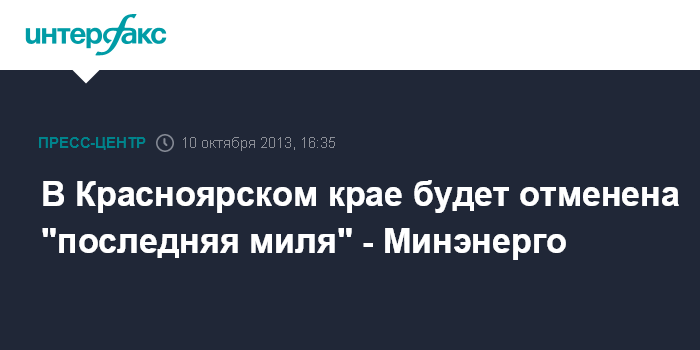 Москва. 10 октября. ИНТЕРФАКС - Минэнерго исключило Красноярский край из регионов, где будет продлена "последняя миля", сообщил заместитель министра энергетики РФ Вячеслав Кравченко в четверг на пресс-конференции в центральном офисе "Интерфакса".
