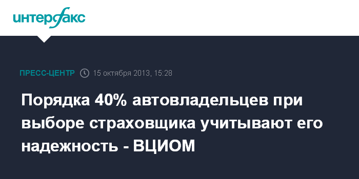 Москва. 15 октября. ИНТЕРФАКС-АФИ - Порядка 40% автовладельцев при выборе страховой компании в первую очередь ориентируются на ее надежность, следует из исследования Всероссийского центра общественного мнения (ВЦИОМ) "Отношение россиян к ОСАГО", результаты которого обнародовал генеральный директор ВЦИОМ Валерий Федоров на пресс-конференции в офисе "Интерфакса".