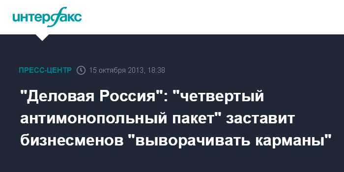 Москва. 15 октября. INTERFAX.RU - Эксперты "Деловой России" считают, что так называемый четвертый антимонопольный пакет существенно ухудшит положение бизнеса в России, расширив полномочия Федеральной антимонопольной службы (ФАС).