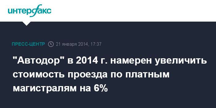 Москва. 21 января. INTERFAX.RU - Государственная компания "Автодор" в 2014 году может увеличить стоимость проезда по платным трассам на 6%, сообщил журналистам глава компании Сергей Кельбах на пресс-конференции в центральном офисе "Интерфакса" во вторник.