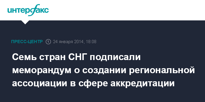 Москва. 24 января. INTERFAX.RU - Семь стран СНГ подписали меморандум о сотрудничестве национальных органов по аккредитации стран СНГ, предполагающий создание региональной ассоциации, заявил руководитель Федеральной службы по аккредитации Савва Шипов на пресс-конференции в центральном офисе агентства "Интерфакс" в пятницу в Москве.