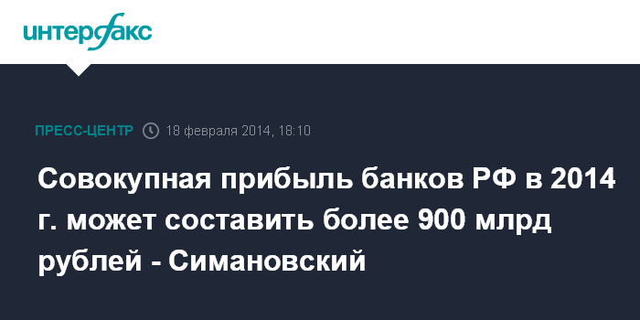 Совокупная прибыль банков РФ в 2014 г. может составить более 900 млрд рублей - Симановский