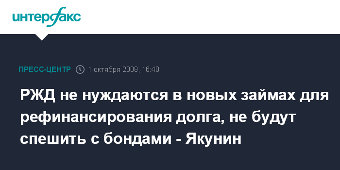 ОАО "Российские железные дороги" не нуждается в привлечении дополнительных заимствований для рефинансирования текущего долга, заявил глава компании Владимир Якунин на пресс-конференции в центральном офисе "Интерфакса" в среду.