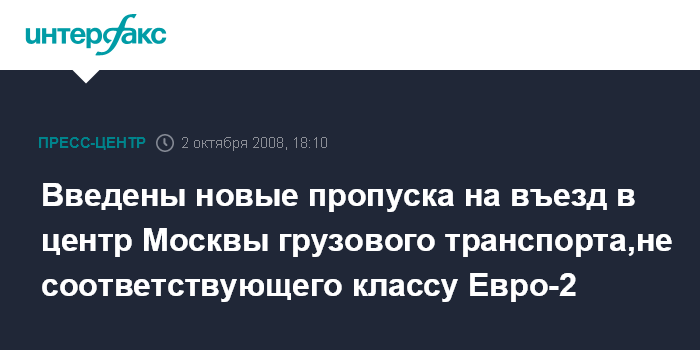 2 октября. ИНТЕРФАКС-МОСКВА - В связи с запретом с 25 сентября на въезд грузового транспорта, не соответствующего экологическому классу Евро-2,вцентральную часть столицы, утверждены новые пропуска на передвижение грузовых автомобилей грузоподъемностью выше тонны и имеющих экологический класс Евро-2 и выше в пределах третьего транспортного и Садового колец,сообщил на пресс-конференции в центральном офисе "Интерфакса"в четверг заместитель начальника управления ГИБДД Москвы Игорь Исаев.
