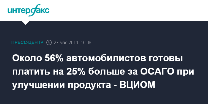 Москва. 27 мая. ИНТЕРФАКС-АФИ - Более половины автомобилистов (56%) считают допустимым повышение цены обязательного страхования гражданской ответственности владельцев транспортных средств (ОСАГО) на 25% при условии внесения определенных изменений в продукт, сказал руководитель отдела по работе с органами государственной власти ВЦИОМ Кирилл Родин на пресс-конференции в центральном офисе "Интерфакса" во вторник.