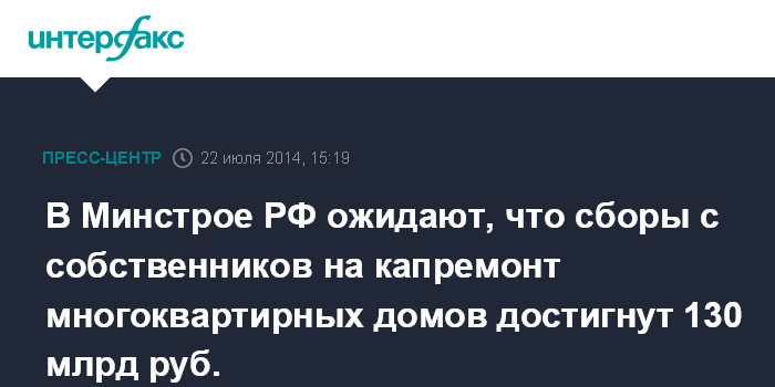 Москва. 22 июля. ИНТЕРФАКС - Около 130 млрд рублей могут собираться ежегодно с собственников жилья на капитальный ремонт многоквартирных домов, сообщил во вторник на пресс-конференции в центральном офисе "Интерфакса" заместитель министра строительства и ЖКХ РФ Андрей Чибис.