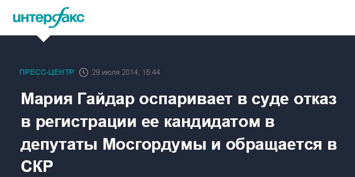 Москва. 29 июля. ИНТЕРФАКС - Глава фонда социальной помощи и поддержки населения "Социальный запрос" Мария Гайдар обжаловала в судебном порядке отказ в регистрации ее в качестве кандидата в депутаты Московской городской думы и намерена обратиться по тому же поводу в Следственный комитет РФ.