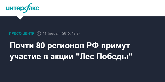 "Мы обратились ко всем губернаторам с призывом поддержать проект "Лес Победы", создать на местах организационные комитеты, штабы, максимально популяризировать проект. Сегодня акцию поддержали 77 регионов России, причем 57 из них уже включили проект "Лес Победы" в организационный план региональных мероприятий", - сказал К.Курченков на пресс-конференции в центральном офисе "Интерфакса" в среду.