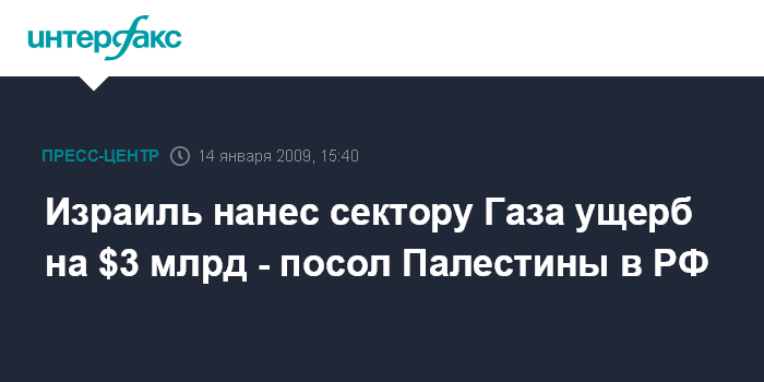 Москва. 14 января. ИНТЕРФАКС - Палестинская сторона оценивает масштаб ущерба, нанесенного сектору Газа израильской военной операцией, в 3 млрд долларов, заявил посол Палестины в РФ Афиф Сафия.
