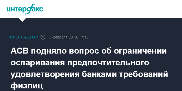 Москва. 13 февраля. ИНТЕРФАКС - Агентство по страхованию вкладов (АСВ) предлагает обсудить возможность внесения в закон поправок, ограничивающих оспаривание сделок по предпочтительному удовлетворению банками (в период процедуры банкротства или в предбанкротный период) требований физлиц.