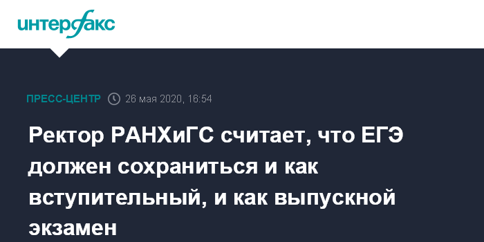 Москва. 26 мая. ИНТЕРФАКС - Ректор Российской академии народного хозяйства и государственной службы при президенте РФ (РАНХиГС) Владимир Мау считает, что ЕГЭ в России следует сохранить и в качестве прозрачного механизма для поступления абитуриентов в вузы, и в качестве инструмента для оценки школы.