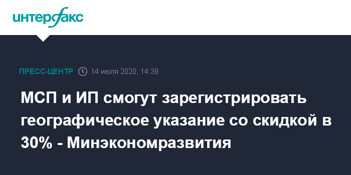 Субъекты малого предпринимательства, индивидуальные предприниматели и аккредитованные образовательные организации смогут зарегистрировать географические указания со скидкой в 30% к базовому тарифу, сообщил директор департамента стратегического развития и инноваций министерства экономического развития РФ Рустам Тихонов на онлайн пресс-конференции в "Интерфаксе", посвященной вступлению в силу закона о географических указаниях (ГУ).
