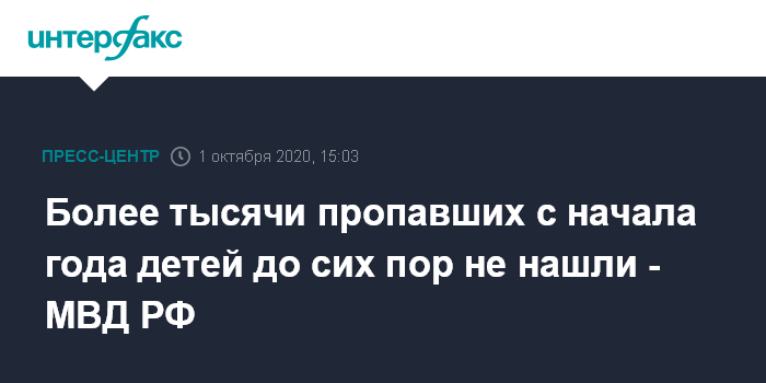 Москва. 1 октября. ИНТЕРФАКС - Свыше тысячи несовершеннолетних числятся пропавшими без вести на территории России с начала 2020 года, сообщил начальник отдела организации федерального розыска скрывшихся, без вести пропавших лиц и идентификационной работы Управления организации оперативно-розыскной деятельности Главного управления уголовного розыска МВД России полковник полиции Максим Черныш.