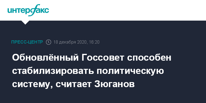 Москва. 18 декабря. ИНТЕРФАКС - Председатель ЦК КПРФ считает, что обновленный Госсовет способен играть стабилизирующую роль в политическом пространстве РФ.
