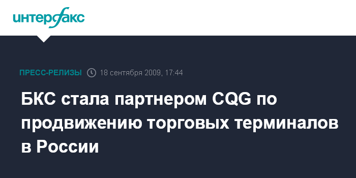 Москва, 17 сентября 2009 года – Финансовая группа БКС, один из ведущих игроков на российском рынке брокерских услуг, будет предоставлять клиентам в России доступ на мировые биржевые площадки через терминалы CQG. О подписании партнерского соглашения компании объявили сегодня на 3-й ежегодной конференции «Мир деривативов Россия 2009», организованной журналом FOW.