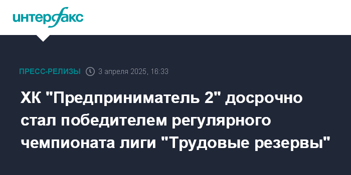 Хоккейный клуб "Предприниматель 2" досрочно стал победителем регулярного чемпионата лиги "Трудовые резервы", оторвавшись от соперников по числу набранных очков. За две игры до завершения регулярного чемпионата команда застолбила за собой первое место в дивизионе "Авиор".