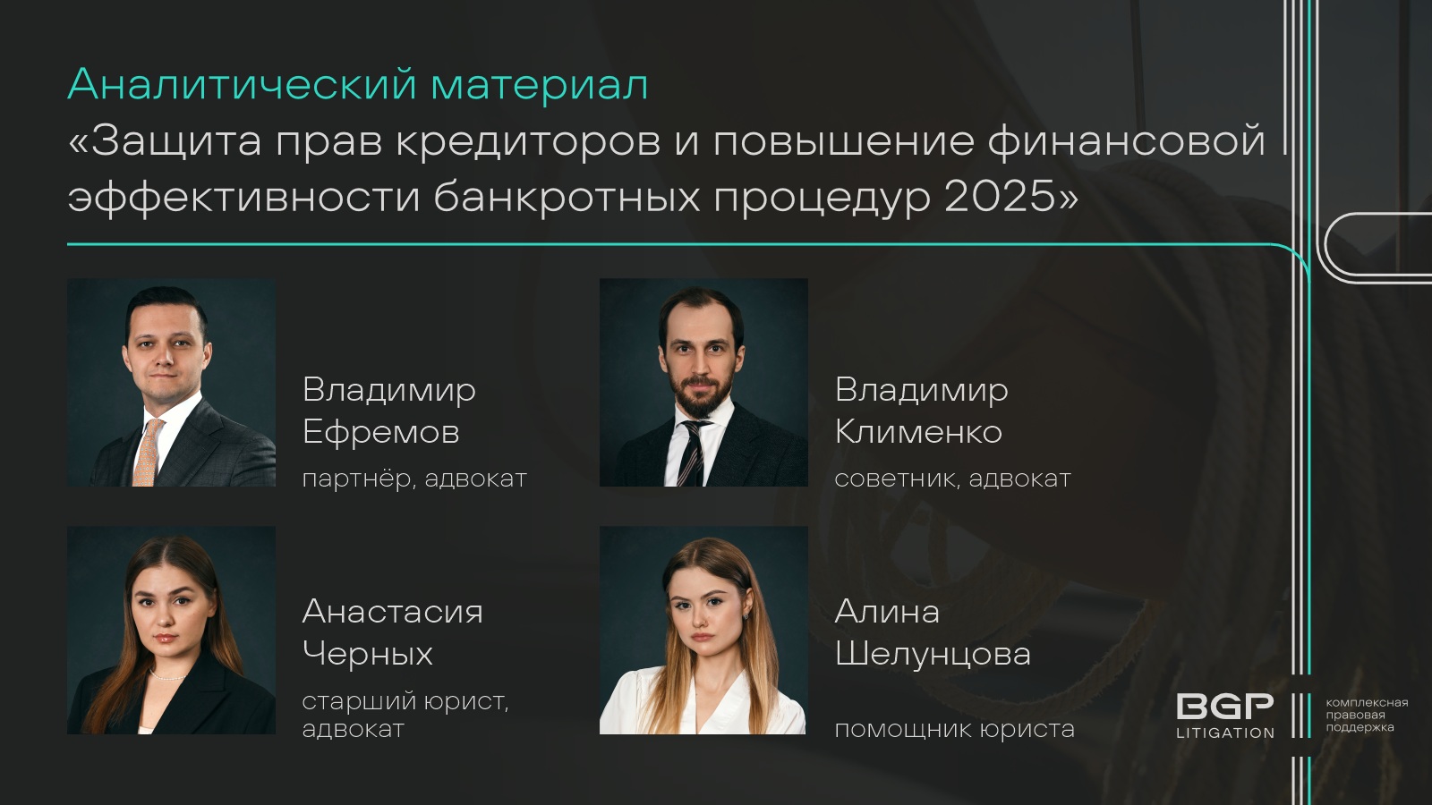 "Цель исследования — сформировать практические подходы, которые помогут кредиторам эффективнее использовать инструменты закона о банкротстве и повышать уровень возврата задолженности", – отметил партнер практики разрешения споров и банкротства BGP Litigation Владимир Ефремов.