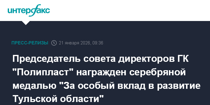 Председатель совета директоров ГК "Полипласт" награжден серебряной медалью "За особый вклад в развитие Тульской области"