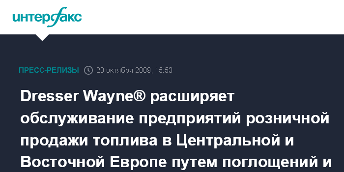 Остин (США, штат Техас). 28 октября BUSINESS WIRE - Компания Dresser Wayne (www.dresserwayne.com) - глобальный лидер в сфере технологий заправки транспортных средств - объявила сегодня о покупке дочерних предприятий Rohe в Польше, Венгрии и Чешской Республике. Dresser Wayne также намерена в течение ближайших недель завершить поглощение долей A.Rohe Holding в Rohe Slovakia и в Bach-Rohe в Швейцарии.