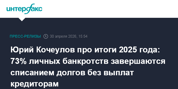 Юрий Кочеулов про итоги 2025 года: 73% личных банкротств завершаются списанием долгов без выплат кредиторам