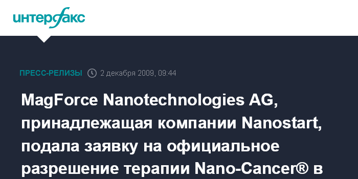Франкфурт и Берлин (Германия). 1 декабря BUSINESS WIRE - Берлинская компания в области медицинских нанотехнологий MagForce Nanotechnologies AG, мажоритарная доля в которой принадлежит Nanostart AG, подала заявку на официальное европейское разрешение для своей терапии Nano-Cancer®.