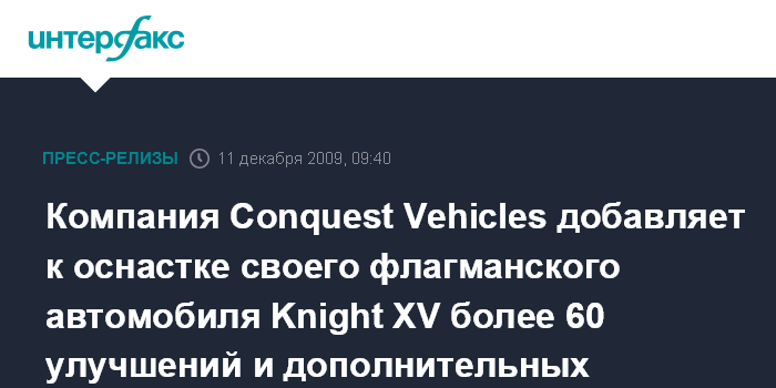 Расположенная в Торонто компания Conquest Vehicles, производящая Knight XV – полностью бронированный, ультрароскошный спортивный внедорожник ручной сборки, объявила о добавлении к оснастке флагманского автомобиля более чем 60 улучшений и дополнительных устройств, служащих для повышения уровня безопасности и комфорта. Это стало известно со слов Уильяма Мэйзлина (William Maizlin), президента компании Conquest Vehicles.