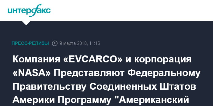 ДАЛЛАС, шт. ТЕХАС и Мыс КАНАВЕРАЛ, шт. ФЛОРИДА - ( 18 марта, 2010) - Компания "EVCARCO" (Внебиржевой рынок ценных бумаг: "EVCA") объявила сегодня, что недавно она, совместно с корпорацией "NASA", инициировала создание серии программ, направленных на разработку автомобилей, работающих на электричестве и альтернативных источниках топлива, в рамках реализации программ Федерального Правительства по созданию автотранспортного парка.