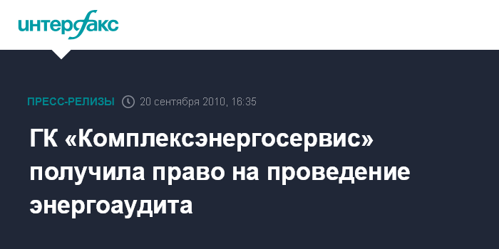 МОСКВА, РОССИЯ. – Группа компаний «Комплексэнергосервис», многопрофильный холдинг, представляющий полный спектр услуг в области энергосбытового и электросетевого бизнеса, сообщает, что управляющая компания Группы – ООО «Комплексэнергосервис» - вступила в саморегулируемую организацию Некоммерческого партнерства «Объединение компаний по энергетическому обследованию в топливно-энергетическом комплексе» (НП «ТЭК Эксперт») с занесением в реестр за номером № 30-08-2010 и получением Свидетельства о допуске к работам по энергетическому обследованию.